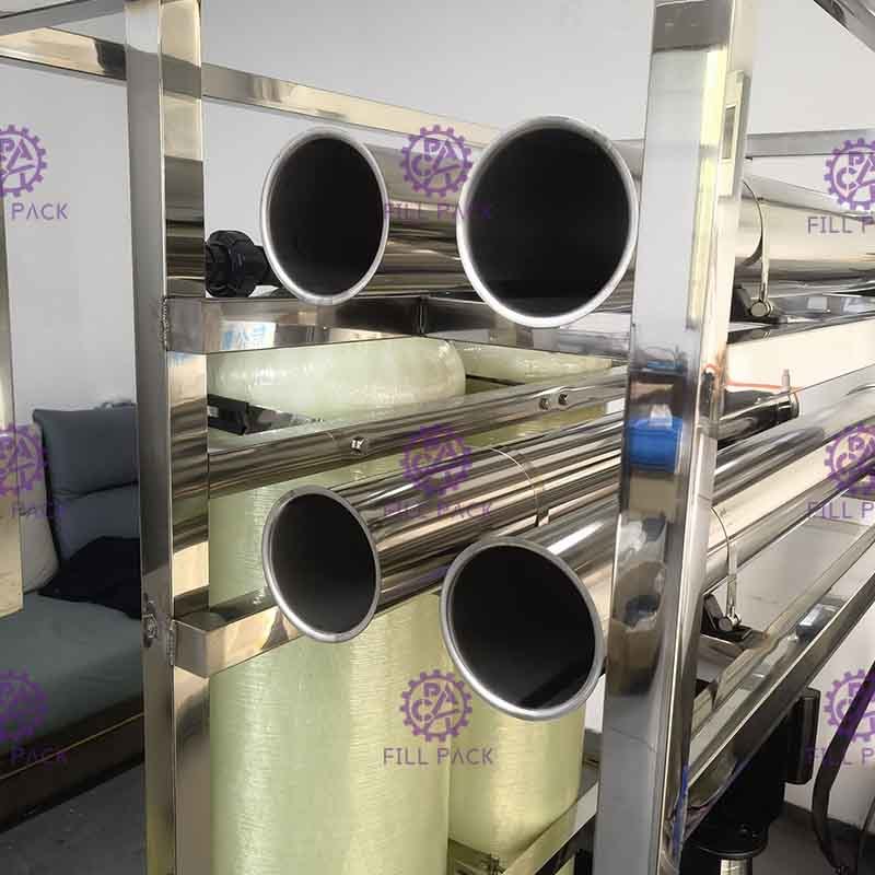 O processo de osmose reversa utiliza membranas de feridas em espiral semipermeáveis para separar e remover sólidos dissolvidos, orgânicos, pirógenos, substâncias coloidais submicron e bactérias da água.A água de alimentação é fornecida sob uma pressão de aproximadamente 16 kg/cm2 através de membranas de osmose reversaA água permeia os poros minúsculos da membrana e é entregue como água purificada. As impurezas na água são concentradas no fluxo de rejeição e lavadas para drenar.A osmose reversa é capaz de remover 90-99% dos sólidos dissolvidos totais (TDS), 99% de orgânicos, incluindo pirógenos, e 99% de bacterianas na água de alimentação.