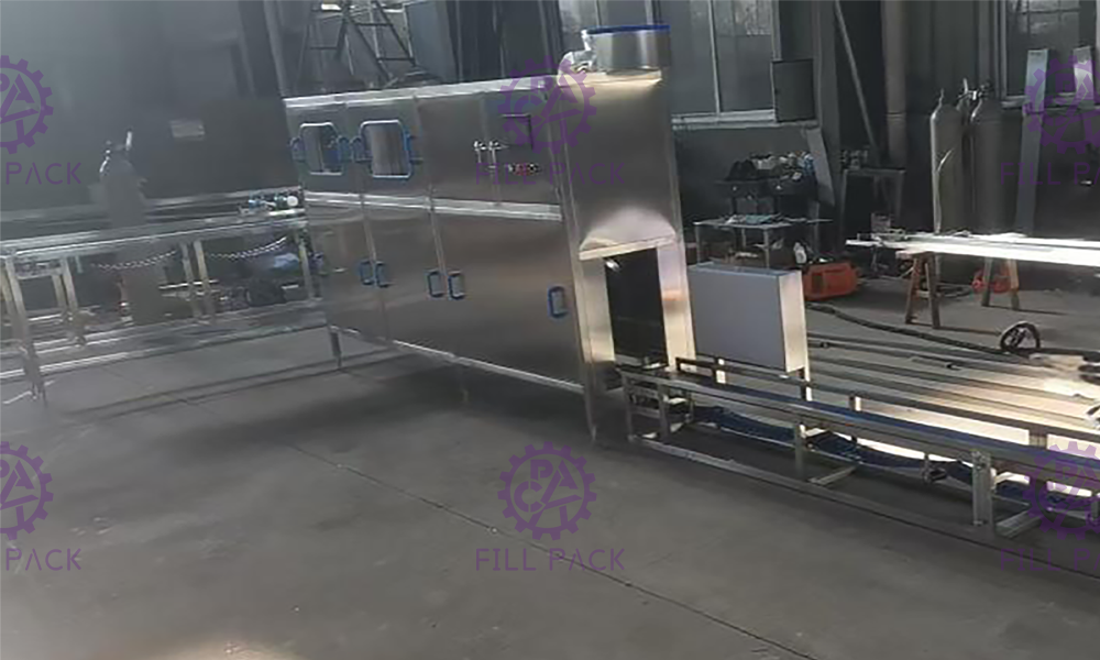 A planta de produção de água Gallon inclui descappadora e lavadora semi-automática, enxaguante-recheador-cappadora Monoblock, transportador de rolos, túnel de encolhimento de rótulos, luz de verificação, máquina de codificação de rolos de tinta sólida