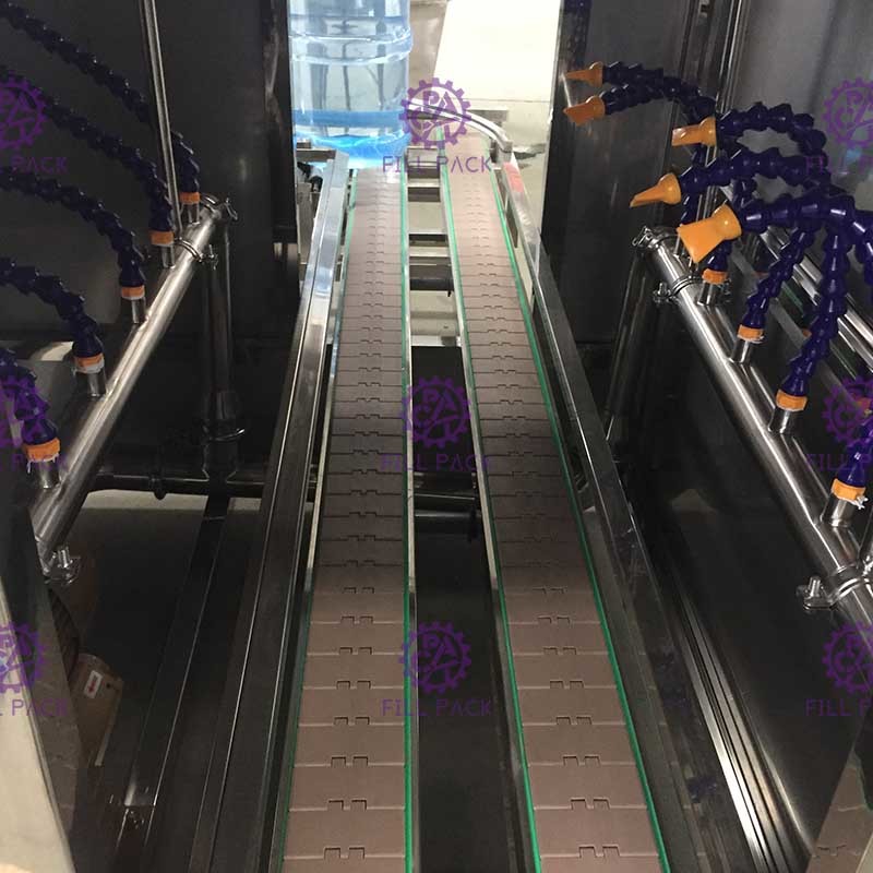 A máquina de enchimento de garrafas de água de 5 galões pode ser dividida em 3 etapas: lavagem, enchimento e tampa, um total de 36 estações de trabalho,processo de trabalho como se segue: