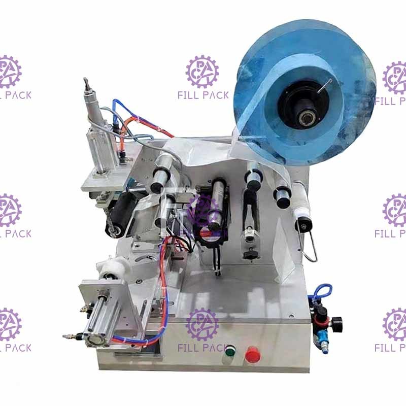 O motor puxa a etiqueta, outro motor faz a garrafa girar, há um cilindro com um rolo na máquina, o cilindro é pressionado para baixo, e então o rolo pressiona a etiqueta, a garrafa gira, impulsiona a etiqueta e completa a rotulagem.