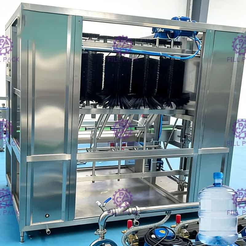 A máquina de escovação externa e enxágue interno de alta pressão é projetada para pré-lavagem eficiente de garrafas de água de 5 galões e 20L. A máquina integra uma escova externa rotativa com enxágue interno de alta pressão para remover poeira, sujeira e impurezas residuais da superfície do barril e da parede interna.